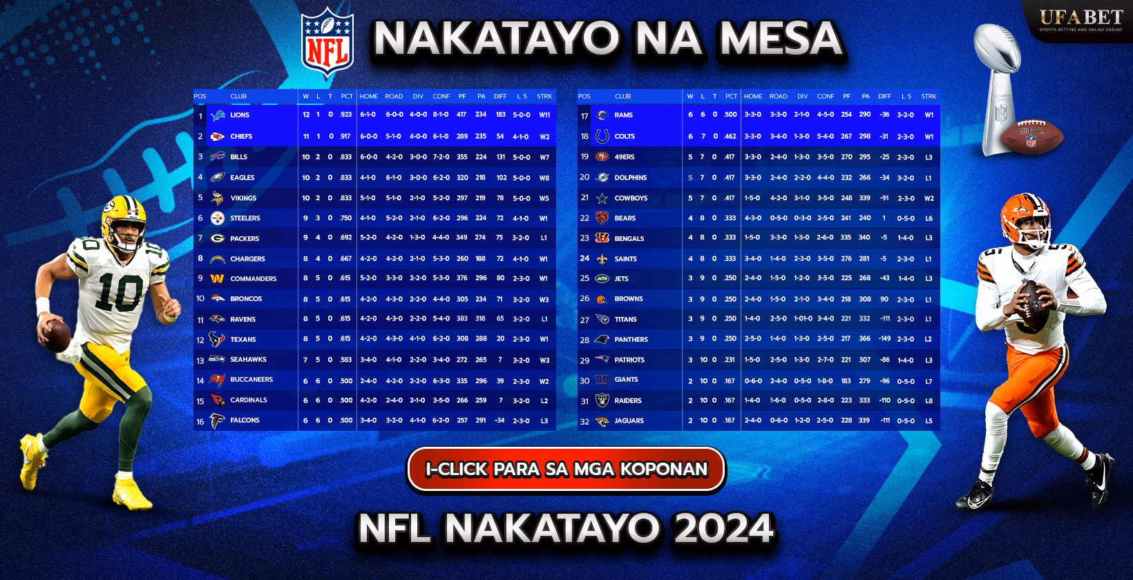 Ang NFL standing table ay isang komprehensibong chart na sumusubaybay at nagpapakita ng performance ng lahat ng team sa buong season. Kabilang dito ang mga column para sa mga panalo, pagkatalo, pagkakatabla, at iba pang pangunahing sukatan gaya ng mga puntos na nakuha, pinapayagan, at porsyento ng panalong. Ang Talahanayan ng NFL ay nahahati sa mga kumperensya (AFC at NFC) at nahahati sa mga dibisyon sa loob ng bawat kumperensya, na tumutulong sa pagraranggo ng mga koponan batay sa kanilang mga tala. Ito ay gumaganap ng isang kritikal na papel sa pagtukoy ng mga kwalipikasyon sa playoff, dahil ang mga koponan ay niraranggo ayon sa kanilang pagganap, at ang mga panuntunan sa tie-breaking ay inilalapat kapag ang mga koponan ay may magkaparehong mga tala. Ang talahanayan ng standing ay mahalaga para sa mga tagahanga, analyst, at opisyal ng liga sa pamamagitan ng pag-aalok ng malinaw na snapshot ng team ranggo ng NFL , records ng NFL , at pangkalahatang pag-unlad.