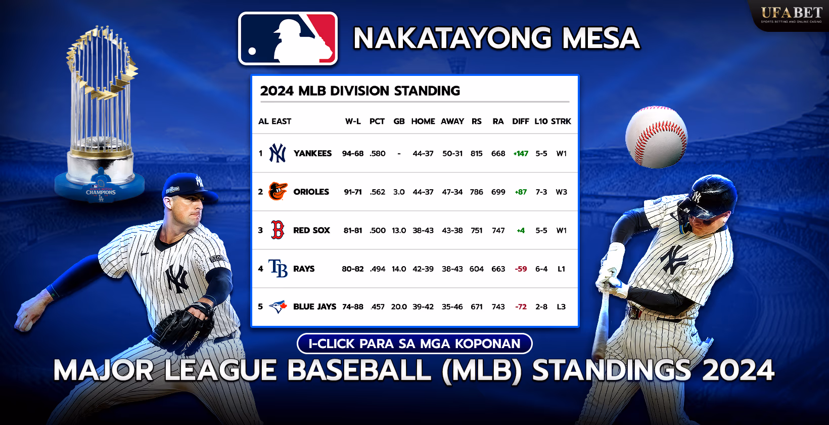 Ang mga koponan ay niraranggo para sa mga posisyon sa mga standing ng MLB ayon sa kanilang mga rekord ng panalo-talo, na ang pangunahing sukatan ay ang porsyento ng panalo. Ang porsyento ay kinakalkula sa pamamagitan ng paghahati sa kabuuang bilang ng mga panalo sa bilang ng mga larong nilaro (panalo at pagkatalo). Ang mga ranggo ng MLB ay sumasalamin sa relatibong pagganap ng Koponan ng MLB sa buong season, na nag-aayos sa kanila ayon sa mga dibisyon sa loob ng American League (AL) at National League (NL). Ang mga koponan ay nakalista sa pababang pagkakasunud-sunod ng kanilang porsyento ng panalo, kung saan ang mga pinuno ng dibisyon ay sumasakop sa mga nangungunang pwesto.